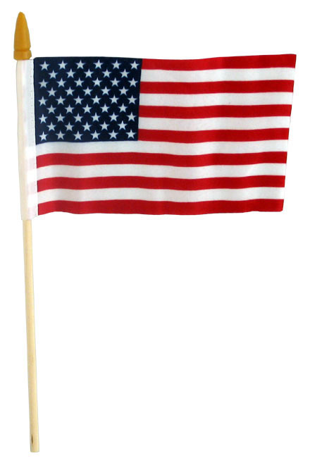 4"x6" Polyester Hand Held American Flag on a 10" wooden pole with a gold decorative top.